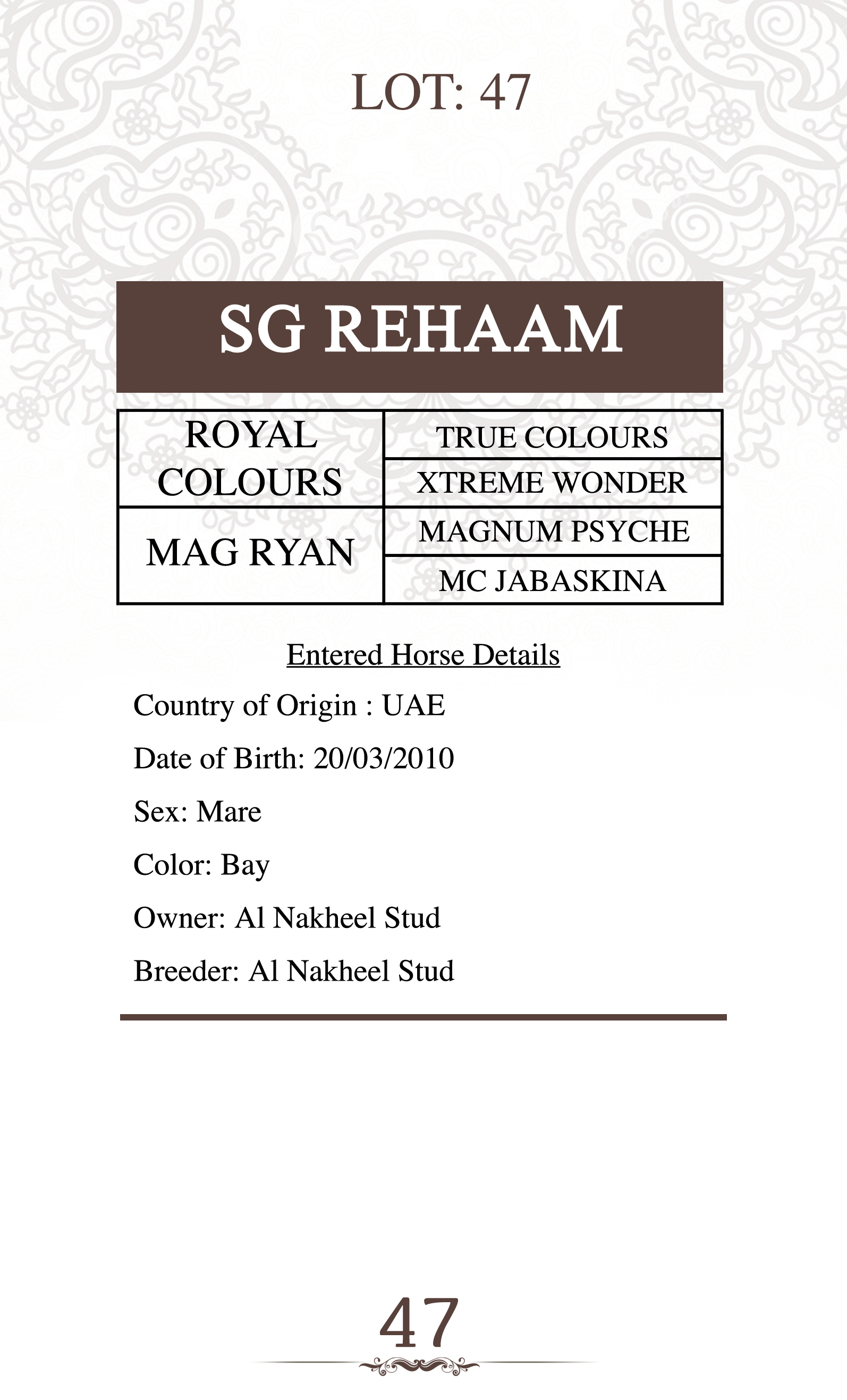 Dam's sire: ROYAL COLOURS